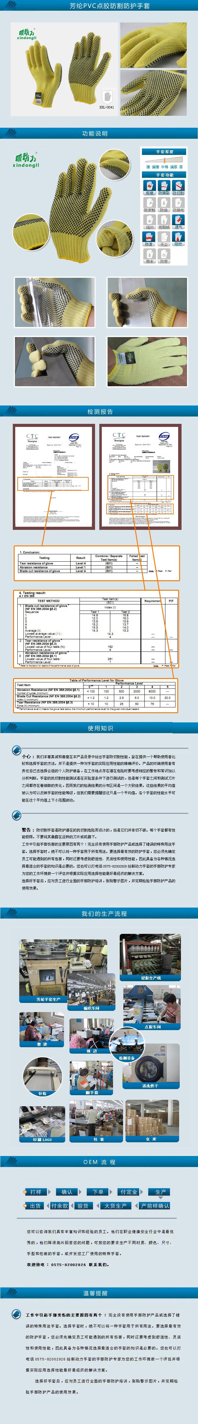 特 性: 芳纶是一种高性能纤维,它具有很高的抗切割能力,弹性好,重量轻,经久耐用,其本身还是一种阻燃材料,可以在高温条件下使用。手套无缝合结构编织更加舒适,减轻手部疲劳。手掌单面PVC点胶,抓握力更好,使用寿命更长。可以机冼和干冼,收缩小。