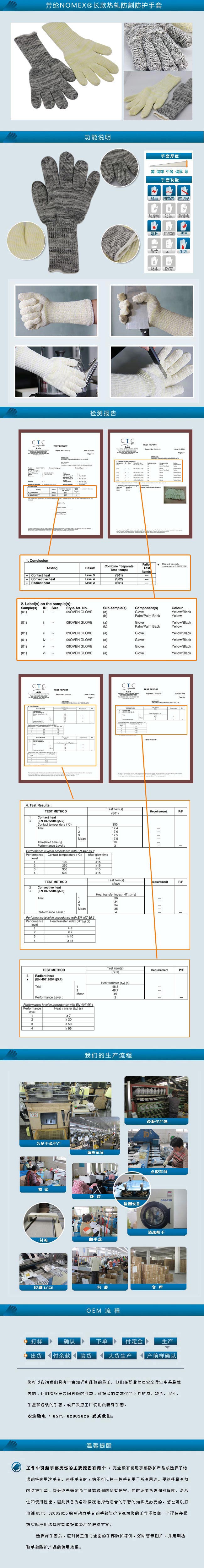特 性: 芳纶是一种高性能纤维,它具有很高的抗切割能力,弹性好,重量轻,经久耐用,其本身还是一种阻燃材料,可以在高温条件下使用。Nomex®(诺梅克斯),一种间位芳纶,也称芳纶1313。特点是耐热性好,强度高。手套外层用这两种材料混织,并用吸汗的棉做内层,加长的腕部能达到很好的隔热、防割、阻燃效果,防间歇性高温达350℃,并不失手部的灵活性,同时左右手可互换,可以机冼和干冼,收缩小,清冼后无需配对,循环使用延长了使用寿命。