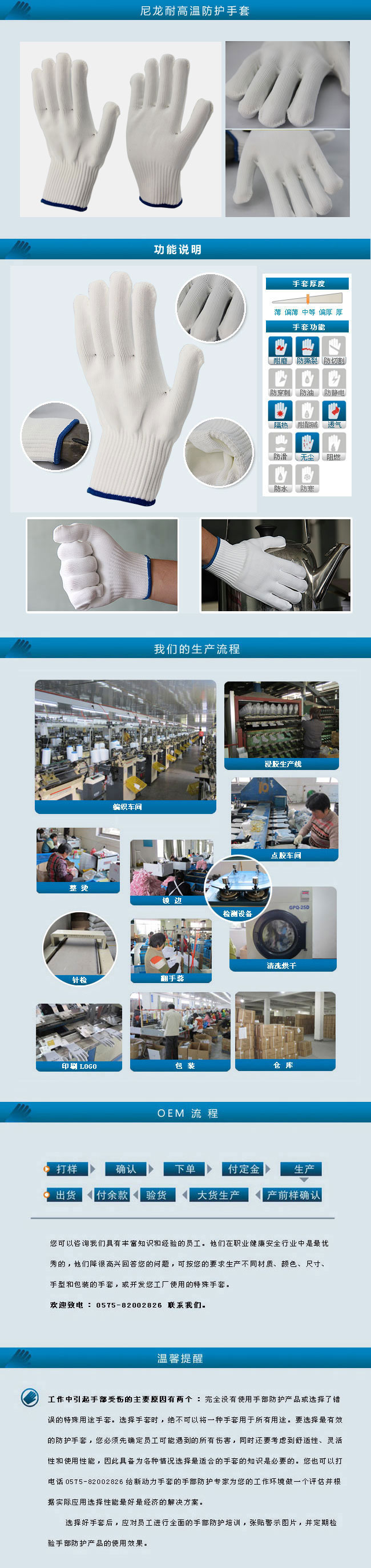 特      性: 采用尼龙10针加厚編织工艺,有不错的隔热效果并且无尘,防间歇性高温达100℃,手部灵活,同时左右手可互换,可以机冼和干冼,收缩小,清冼后无需配对,循环使用延长了使用寿命。