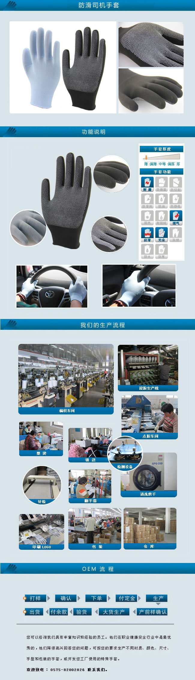 特 性: 13针尼龙丝无缝编织。手掌加细小的PVC点胶,手套轻薄触感好,操控方向盘更加灵活,抓力好,防滑,耐磨,使用寿命长,可重复使用。手背无PVC点胶,更加透气,无尘。产品环保无毒,手套原料不产生静电,清冼时收缩小。
