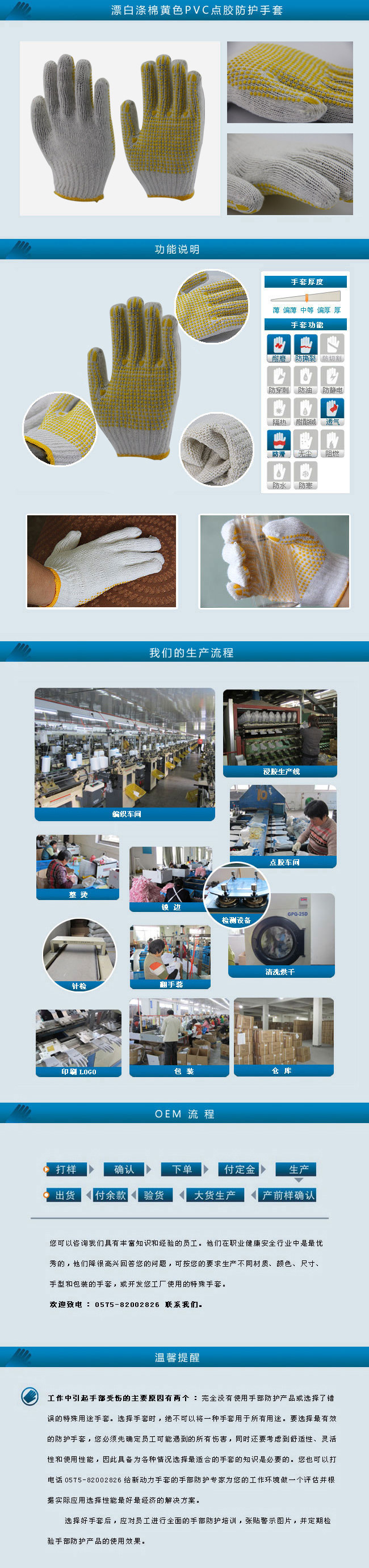 漂白涤棉混纺的纱线7针工艺无缝编织而成,吸汗透气,手套加厚,手感舒适。单面PVC点胶,使抓力更好,防滑,更耐磨,使用寿命更长,经济使用,为个人和企业节省成本。